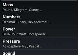 Die Anwendung unterstützt 20 verschiedene Kategorien, darunter: Beschleunigung, Winkel, Fläche, Bytes, Strom, Energie, Kraft, Beleuchtung, Induktivität, Länge, Größe, Masse, Leistung, Druck, Strahlung, Temperatur, Zeit, Drehmoment, Geschwindigkeit, Volumen. Tipp: Wechseln Sie schnell in die andere Kategorie, indem Sie auf den Kategorienamen tippen.