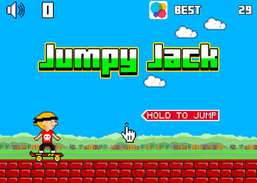 *** BE CAREFUL: ONLY FOR PRO GAMER ***Are you ready for the ultimate challenge?The new Jumpy Jack is now on your iPhone, iPod and iPad!Tap on your device to make Jack jump. Avoid obstacles to level up. Win fantastic trophies to pimp Jack up... But most importantly... Smash your friends high score.10 incredible trophies to make Jack look even cooler:- Thunderbolt T-Shirt (5 pts)- Red Karate Bandana (10 pts)- Heavy Metal T-Shirt (15 pts)- Black KungFu Bandana (20 pts)- Pro Skater Pants (25 pts)- King of Skate Black Shirt (30pts)- New Galaxy Skate (35pts)- Ninja Suit (40 pts)- RedDragon Bandana (45 pts)- Ninja Master Belt (50 pts)and..... more to come!Have Fun!