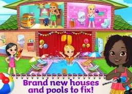 ¿Qué es el verano sin piscina? ¡Ayuda a Fix It Girls a traer el verano al vecindario usando tu creatividad y buen ojo para el diseño para arreglar la piscina junto con el resto de la casa! ¡Limpia, repara y decora cada habitación de la casa para que se vea nueva y hermosa! ¡Repara electrodomésticos, restaura muebles viejos, elige entre toneladas de colores de pintura y más! ¡Obtenga hermosas adiciones a cada habitación a medida que las arregla! ¡Juntos, pueden arreglar cualquier cosa!